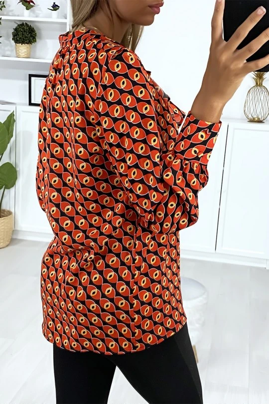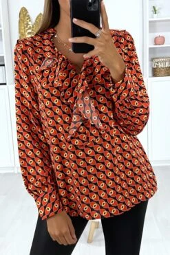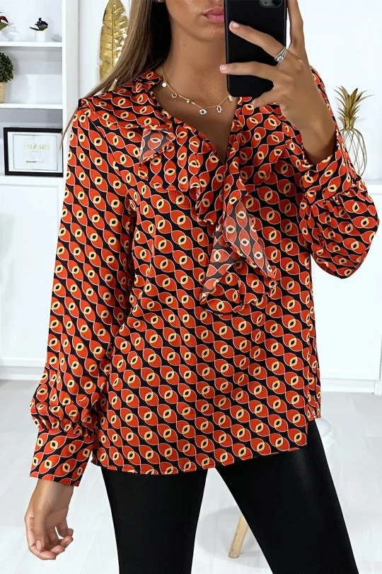 Blouse pour femme à motif noir avec volant à l’avant. Vêtement mode femme pas cher