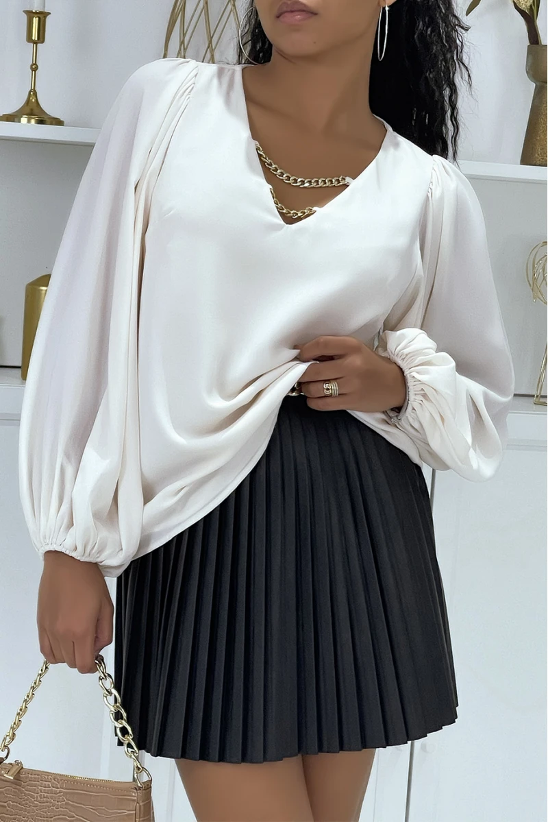 Blouse beige manches bouffante avec accessoire au col. Vêtement mode femme tendance