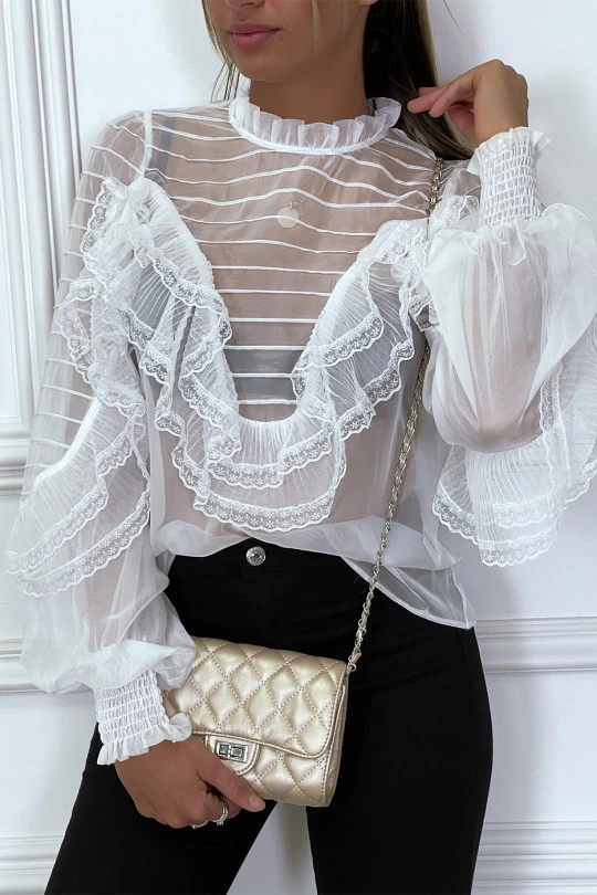Blouse blanche en tulle avec broderie et volant. Belle blouse noir en tulle avec manches bouffante et volant brodĂ©.Â