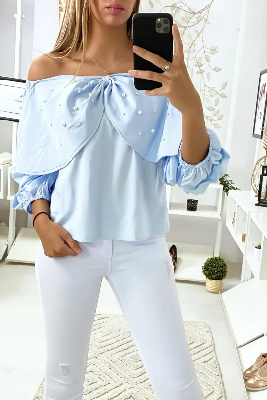 Blouse femme très chic en bleu avec papillons ornée de strass à l’avant