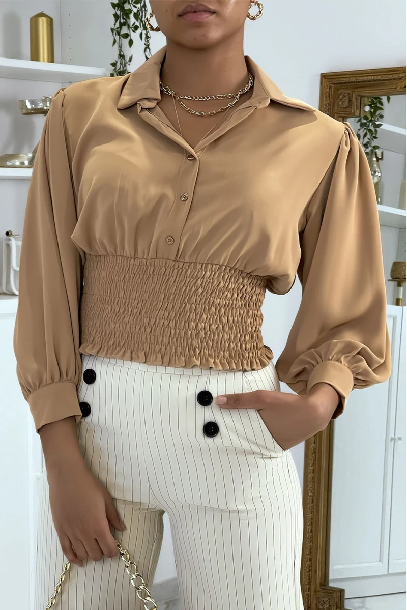 Blouse courte camel à boutons.
