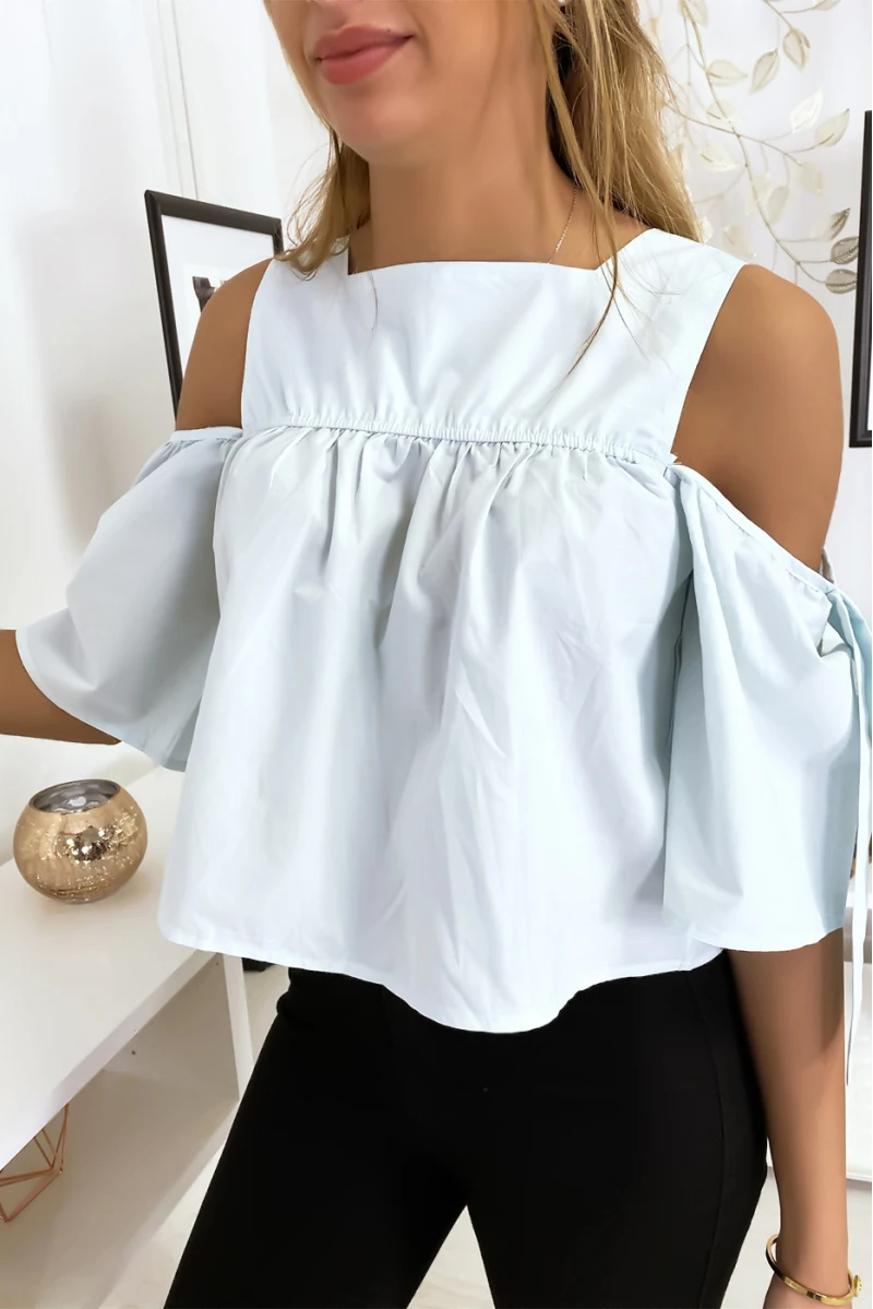 Blouse crop top bleu avec noeuds. Joli top léger pour les dernières tendances femmes.
