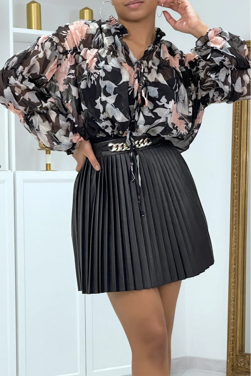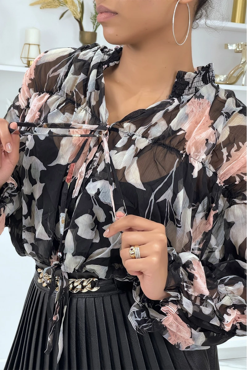 Blouse fleurie à nouer en tulle noire.
