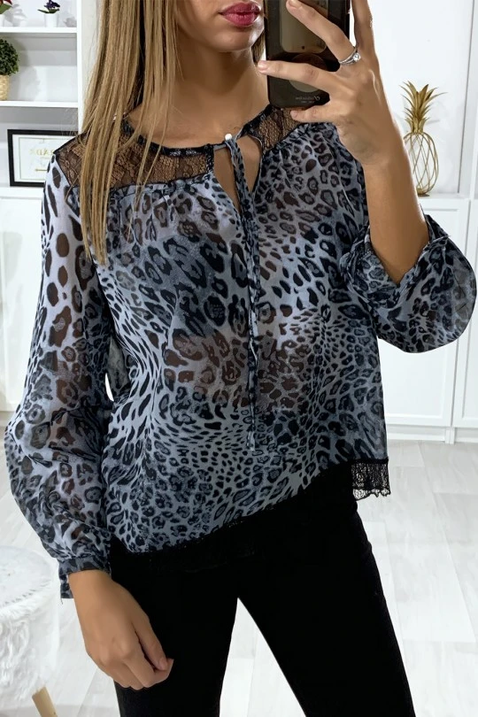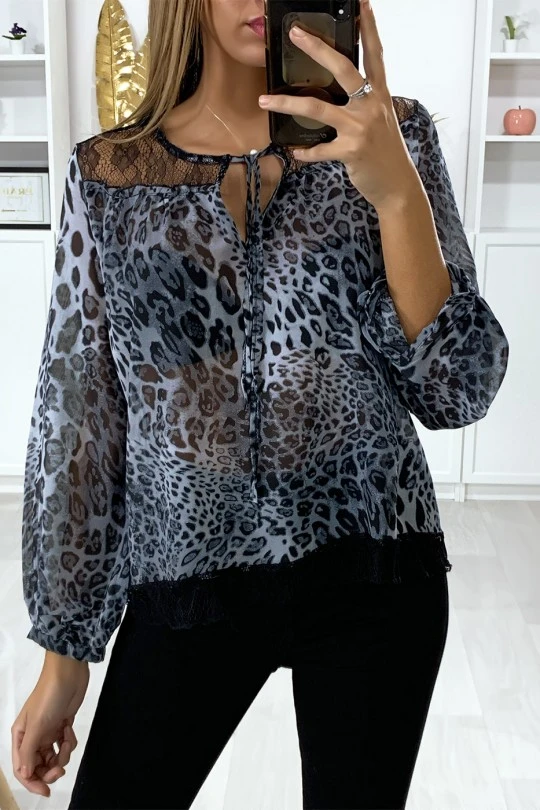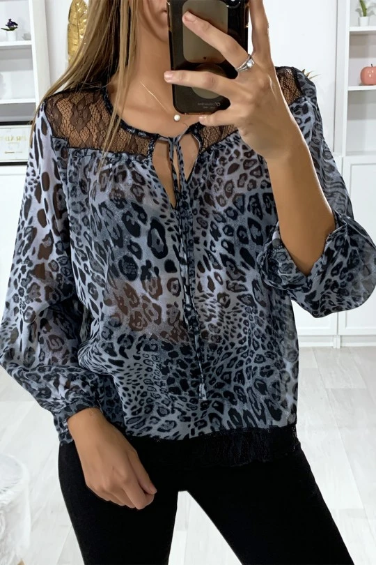 Blouse motif leopard gris pour femme avec dentelle au buste. Vêtement femme