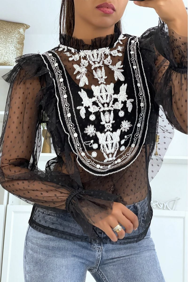 Blouse noire en tulle avec volant et broderie. Blouse blanche pour femme très chic et tendance avec volant et broderie