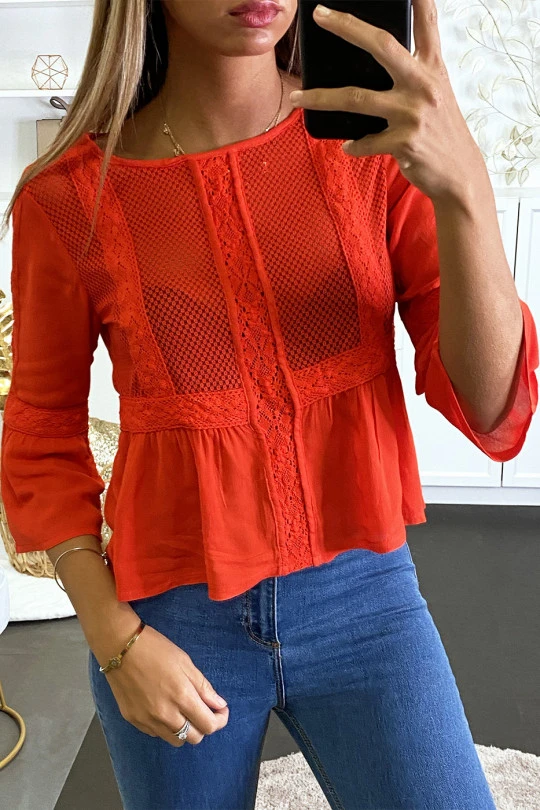 Blouse rouge à dentelle sur le devant et volants.