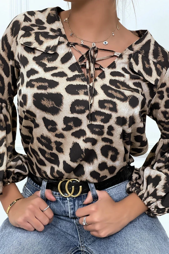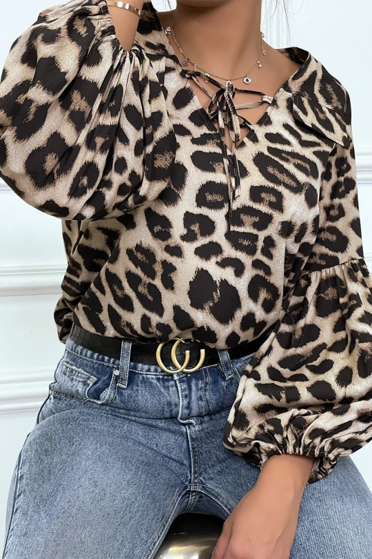 Blouse Taupe Imprimés Léopard, à Manches Bouffantes