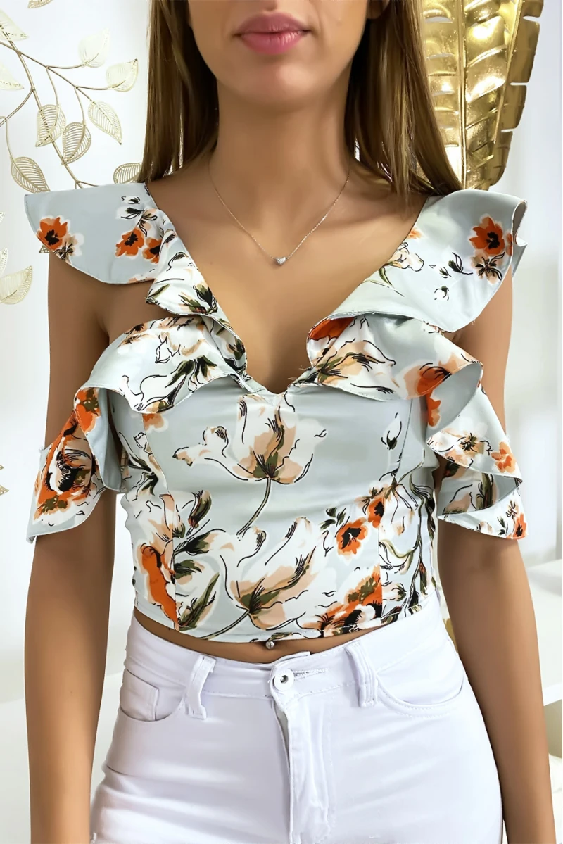 Crop top bleu à fleur à manches ouvertes. Joli top féminin pour la saison printemps/été.