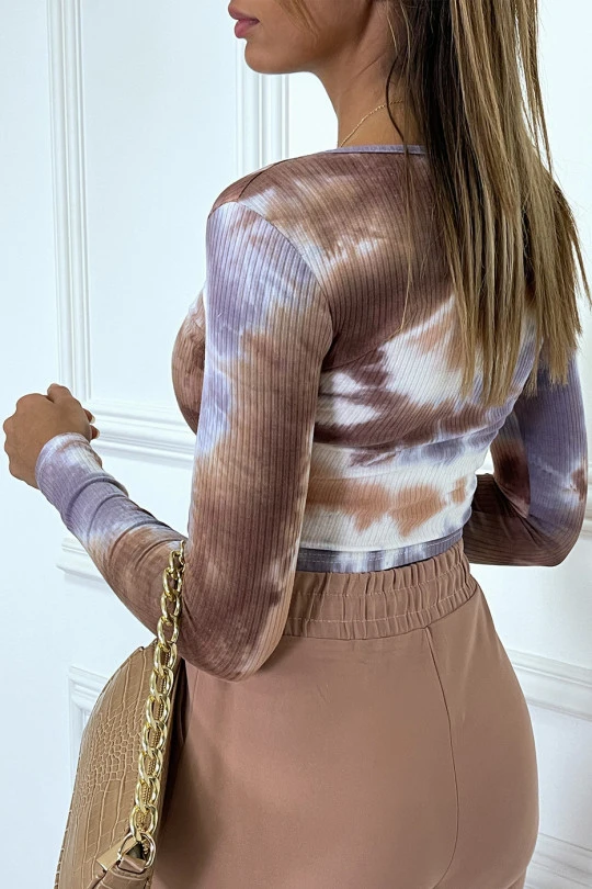 Crop top côtelé choco tie & dye à pression au col