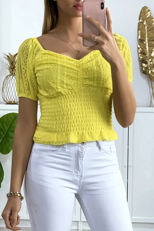 Crop top femme en dentelle jaune avec élastique à la taille. Mode femme pas cher