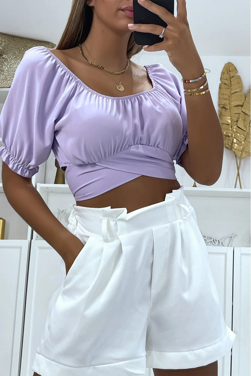Crop top lilas à col bardot croisée sous la poitrine et se noue au dos