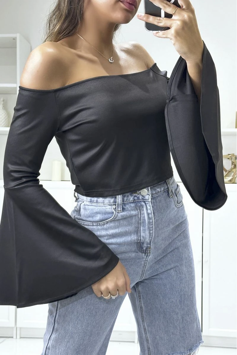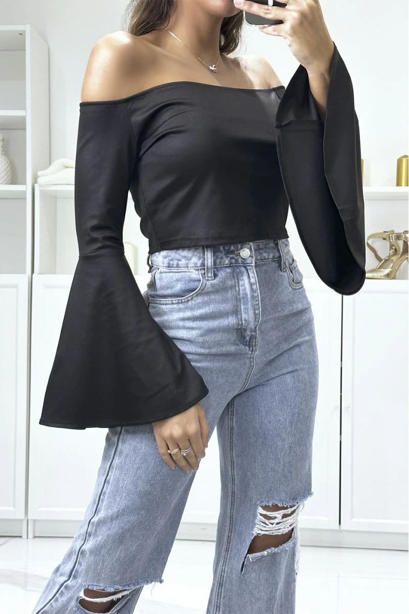 Crop top noir col bateau avec manche évasé