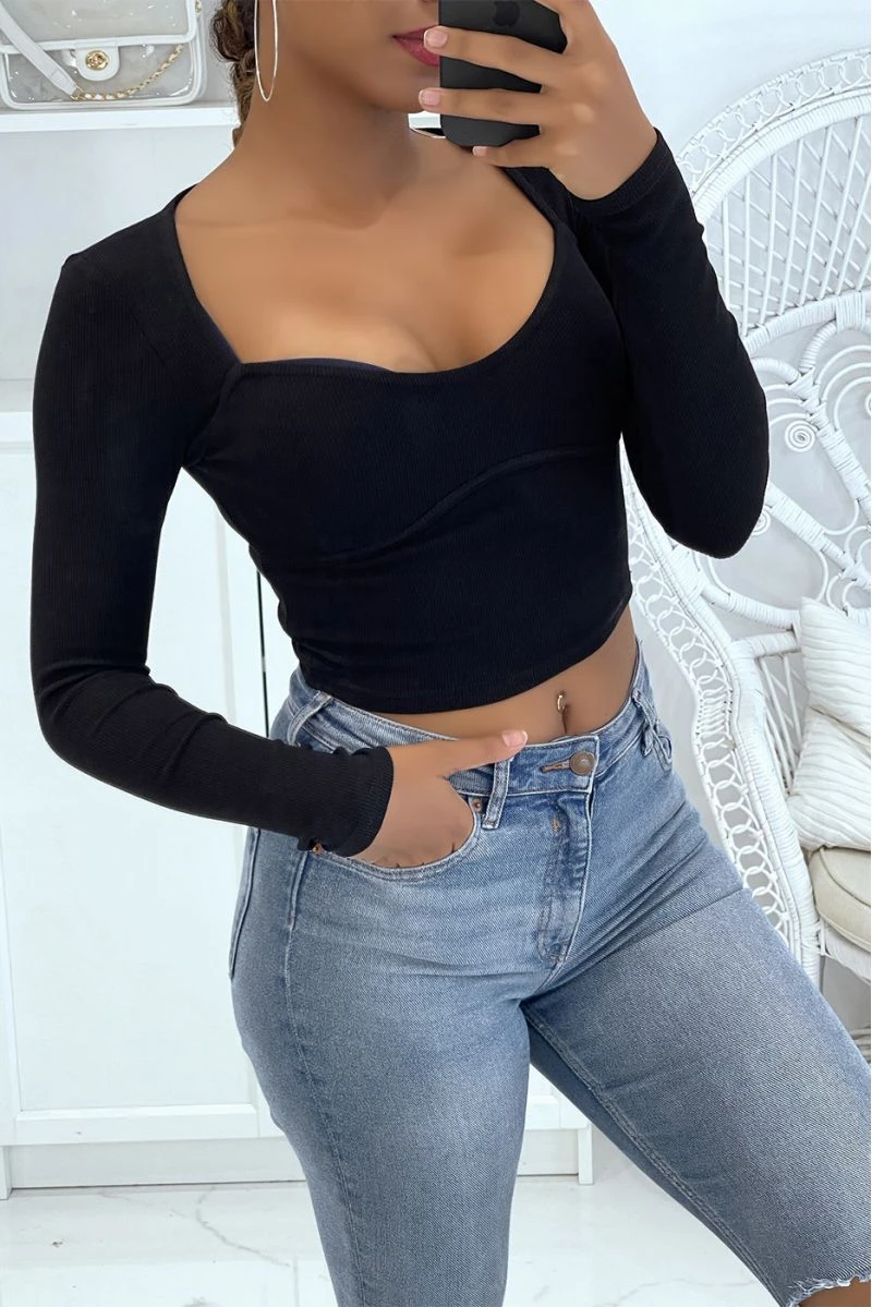Crop top noir côtelé à col décolleté en forme de coeur, très tendance idéal avec un jean slim blanc taille haute