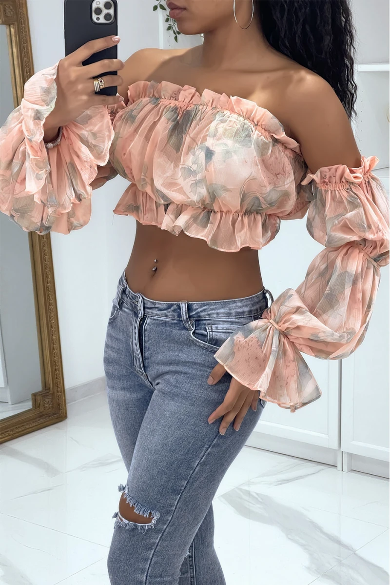 Crop top rose à manches longues fleuri