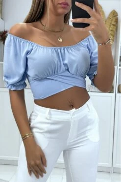 Crop top turquoise à col bardot croisée sous la poitrine et se noue au dos