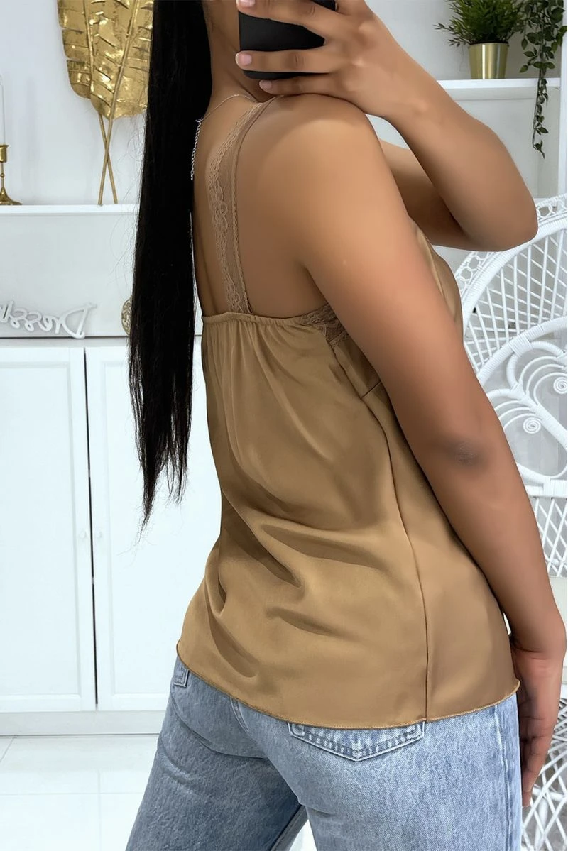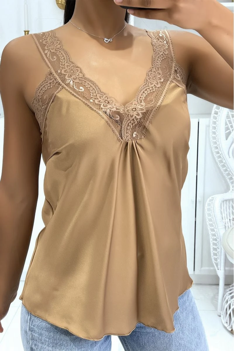 Débardeur ample taupe satiné à col V en dentelle hyper glamour
