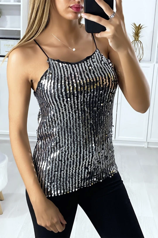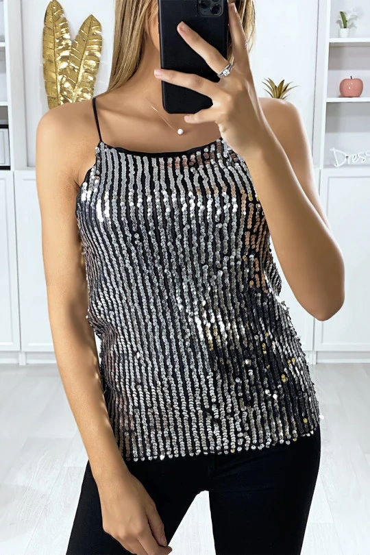 Débardeur argenté et pailleté pour femme avec fine bretelles. Mode femme pas cher