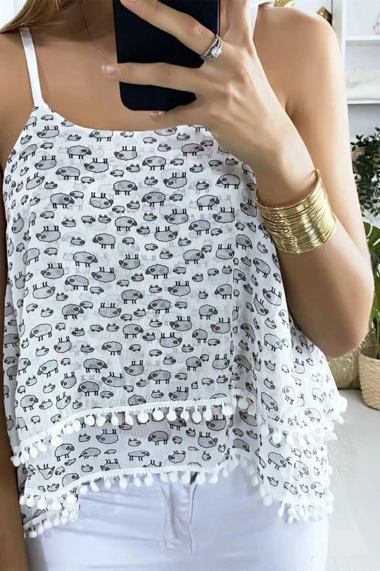 Débardeur pour femme en blanc à volant avec motif et mini pompon. Mode femme pas cher