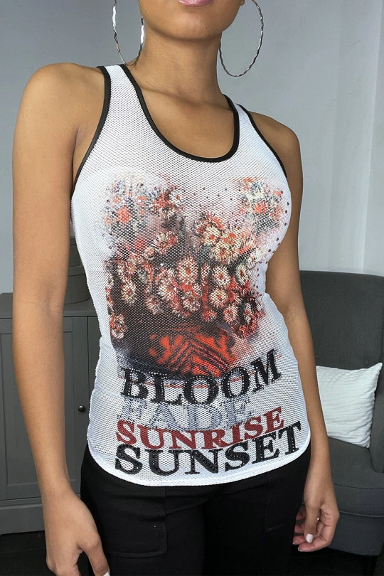 Débardeur blanc filet style rock à motif fleurs. Tshirt débardeur Tendance rock avec motif fleurs printemps/été
