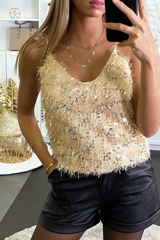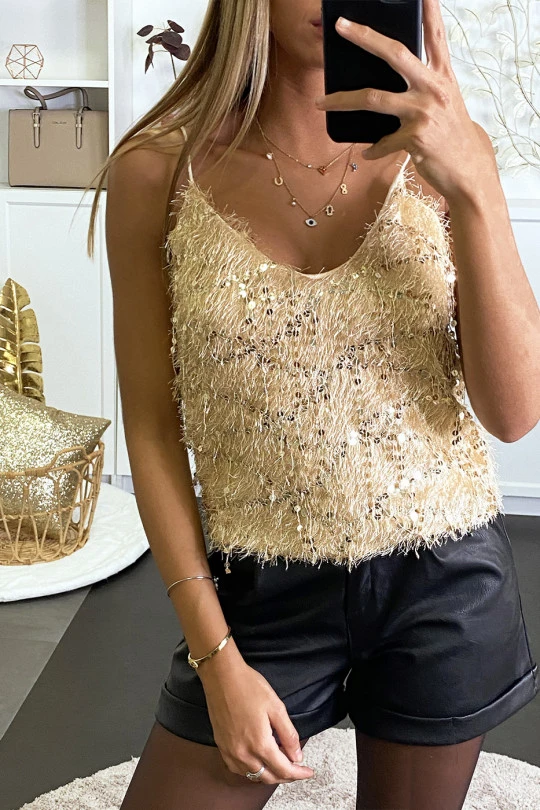 Débardeur duveteux doré à poile long et scintillant. Débardeur fashion idéal pour fêtes et soirées