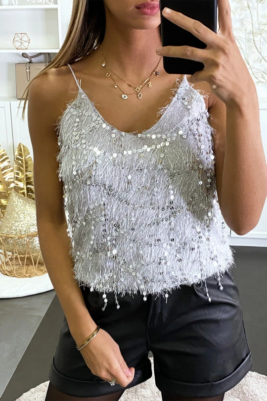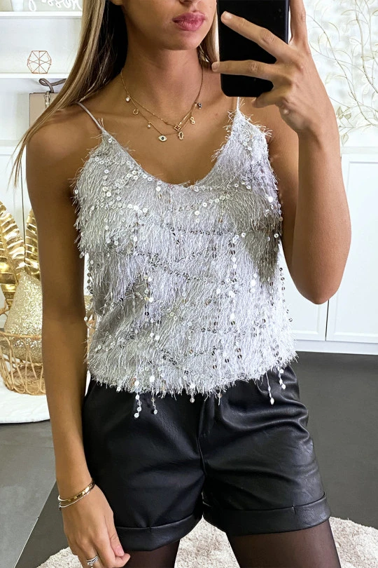 Débardeur duveteux gris à poile long et scintillant. Débardeur fashion idéal pour fêtes et soirées