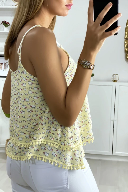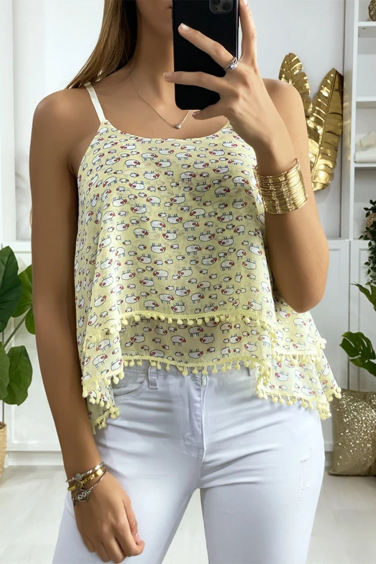 Débardeur pour femme en jaune à volant avec motif et mini pompon. Mode femme pas cher