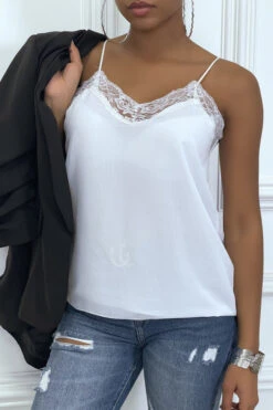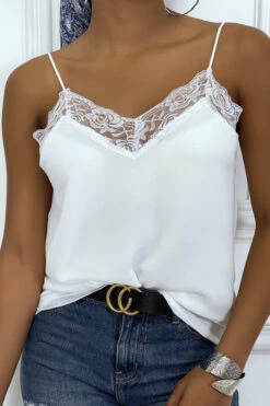 Top Débardeur Blanc Fine Bretelles Col En Dentelle