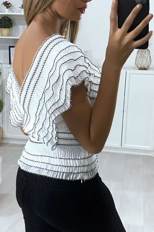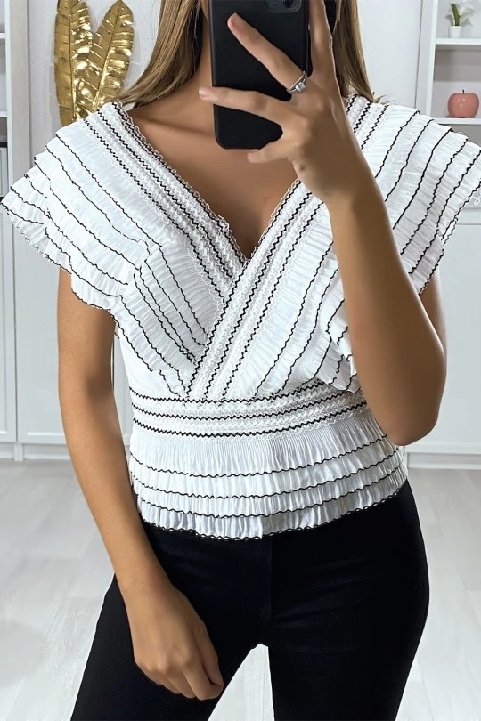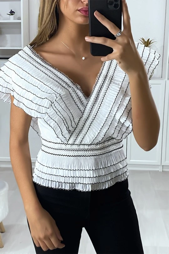 Haut cache coeur pour femme en blanc avec plissé et volant. Vêtement mode femme