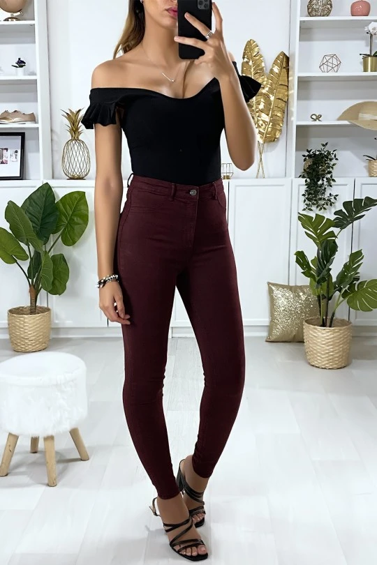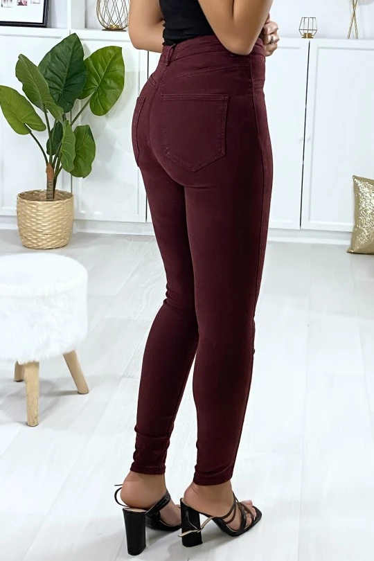 Jeans slim pour femme en bordeaux avec fausse poches à l’avant. Jeans femme pas cher