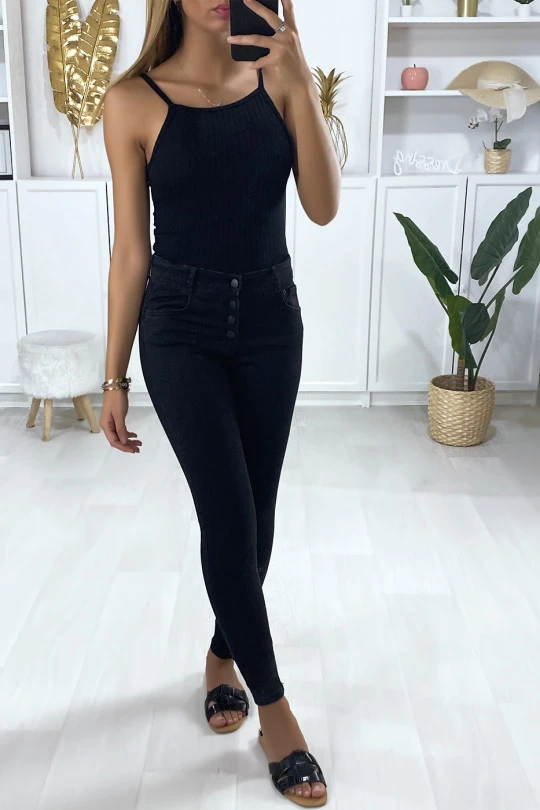 Jeans slim noir boutonné à l’avant avec poches. jeans femme pas cher