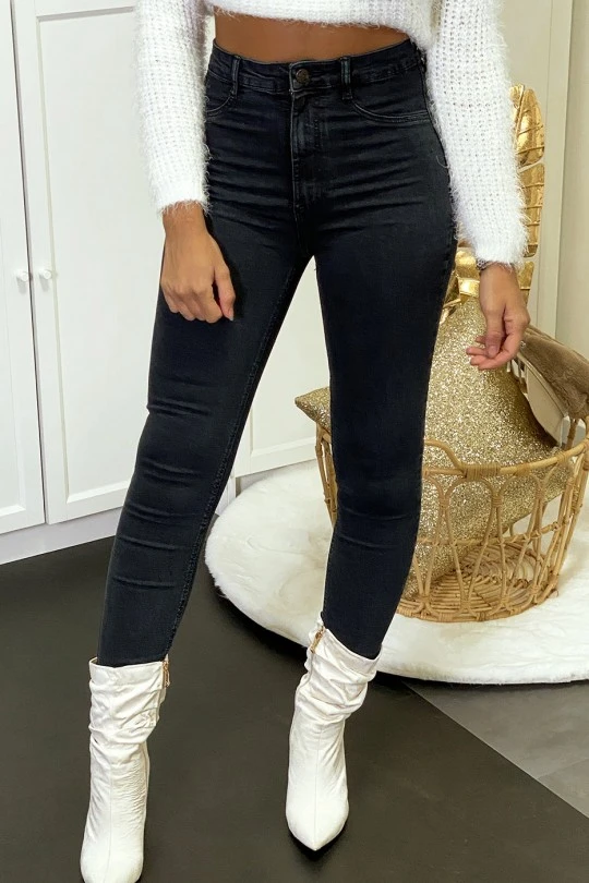 Pantalon jeans slim noir délave pour femme avec poches arrières. Jeans délavé pour femme