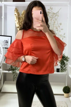 Top Rouge Satiné Avec Manches Volante Et Buste En Tulle