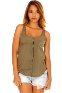 Vendu Par 3 Chemisier Sans Manches Kaki Ă Poche Strass Et Dos Dentelle. F2030