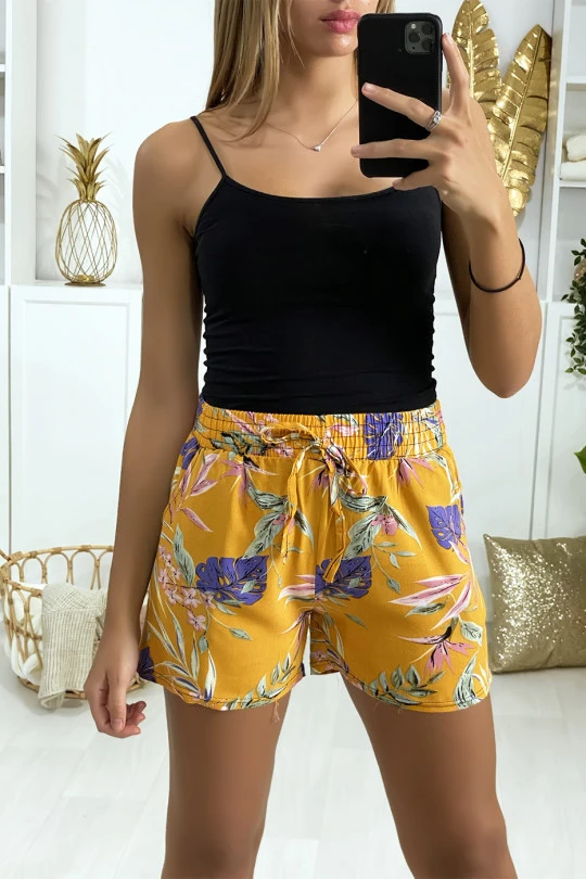 Short moutarde en coton motif fleuris avec poches. Vêtement femme pas cher