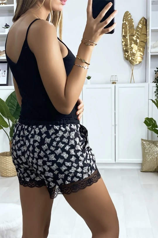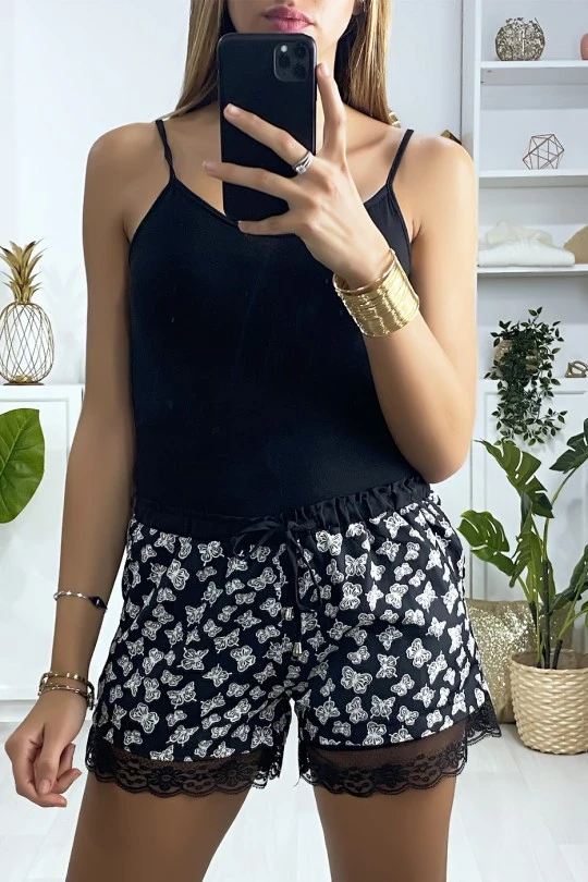 Short noir pour femme motif papillon doublé avec dentelle. Vêtement mode femme pas cher